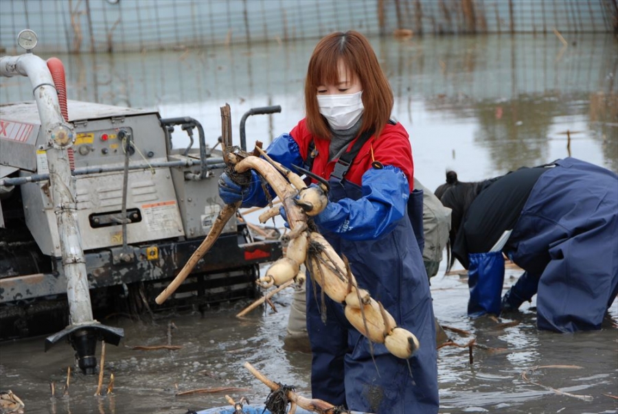 レンコン畑に入ると予測はしていたものの、泥に脚が取られて歩くのが大変!お約束のコケて泥まみれになることはなかったものの、悪戦苦闘する一幕も。それでも土の中で手探りしながら大きなレンコンが取れた時には、喜び一杯でした!