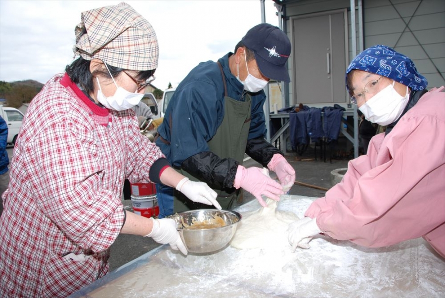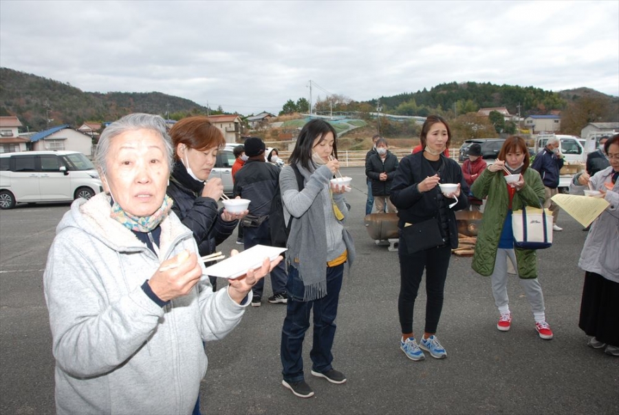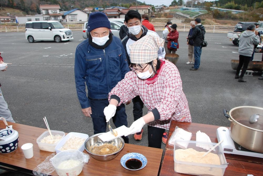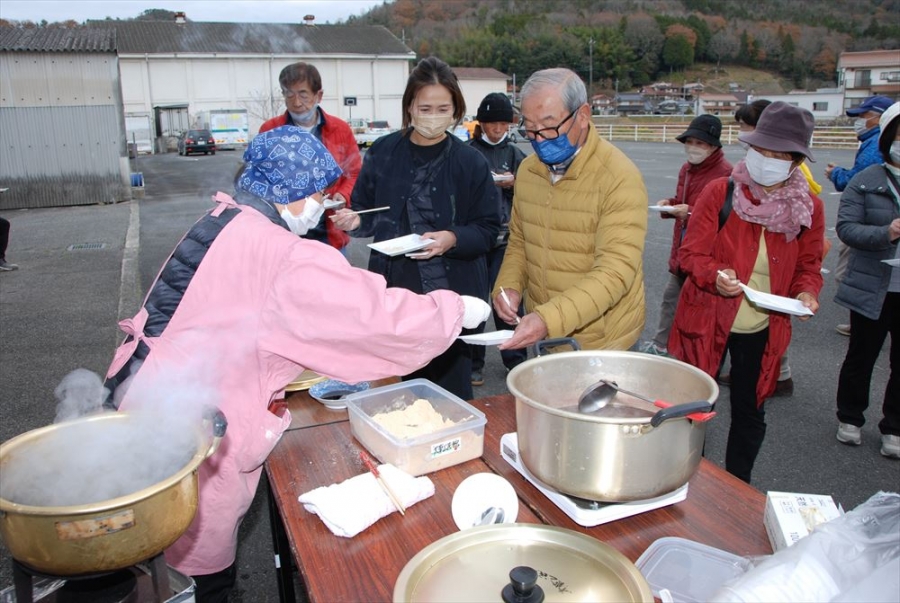 レンコン収穫体験は終わったら、再び大草公民館に帰ってみると、そこには「きな粉餅」「大根餅」「ぜんざい」「お餅の海苔巻き」や「レンコンの酢の物」が地元の協力者の方々によって用意され、参加者に振る舞っていただきました。