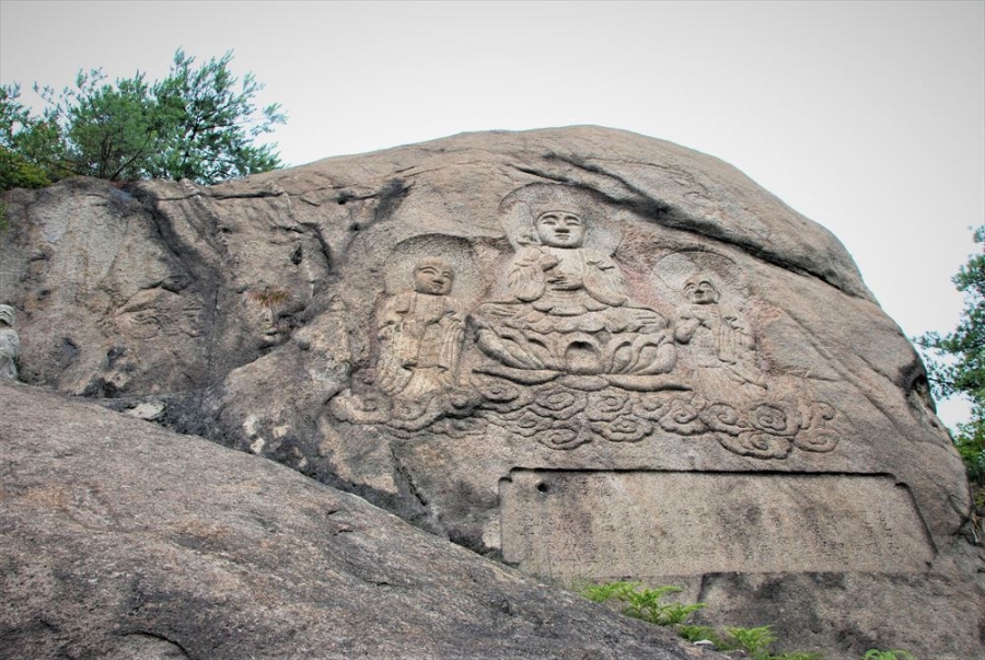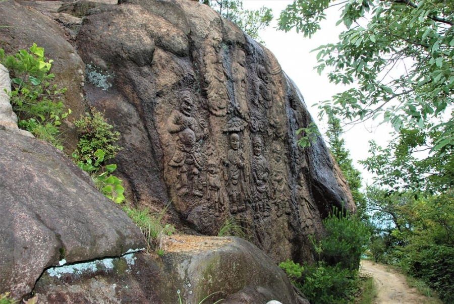 白滝山の山頂手前にある龍泉寺を通り抜け、山頂に向かうと八畳岩と呼ばれる花崗岩の大岩が迎えてくれる。その岩肌に画かれた磨崖仏は釈迦三尊像と十六善神像。山頂への細い道から落ちることを気にしながらも、思わず手を合わさずにはいられない。