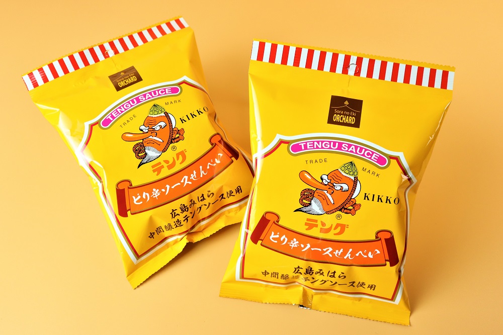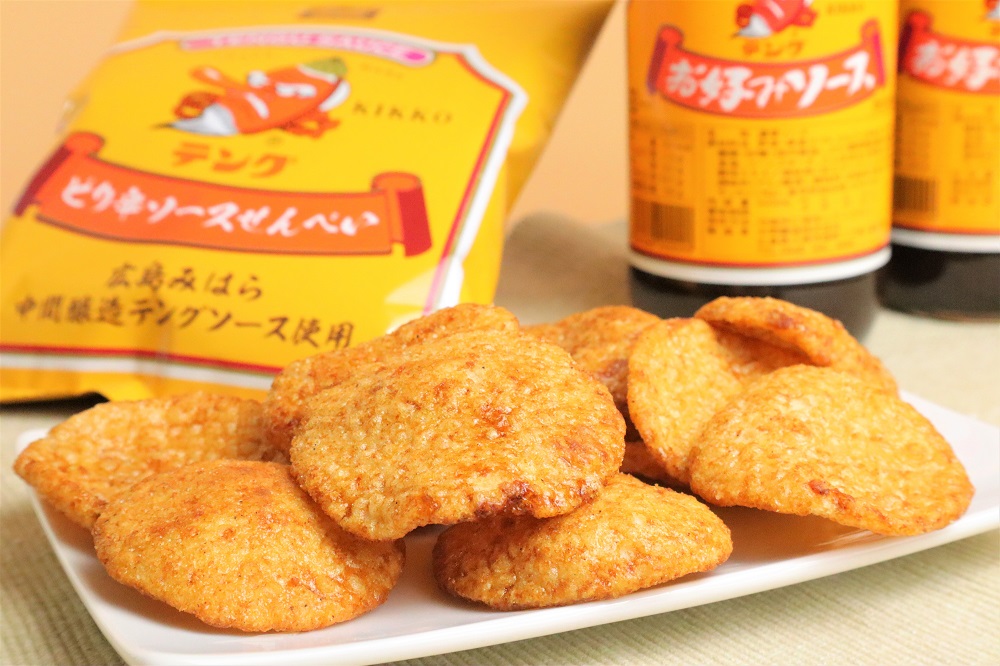丁寧に揚げたサクサクの揚げ煎餅に、広島みはら中間醸造のテングソースを絡めてしっとり仕上げた商品です。テングソースの濃厚な甘みとコク、スパイシーさはやみつきになること間違いなしのソース煎餅に仕上がりました。