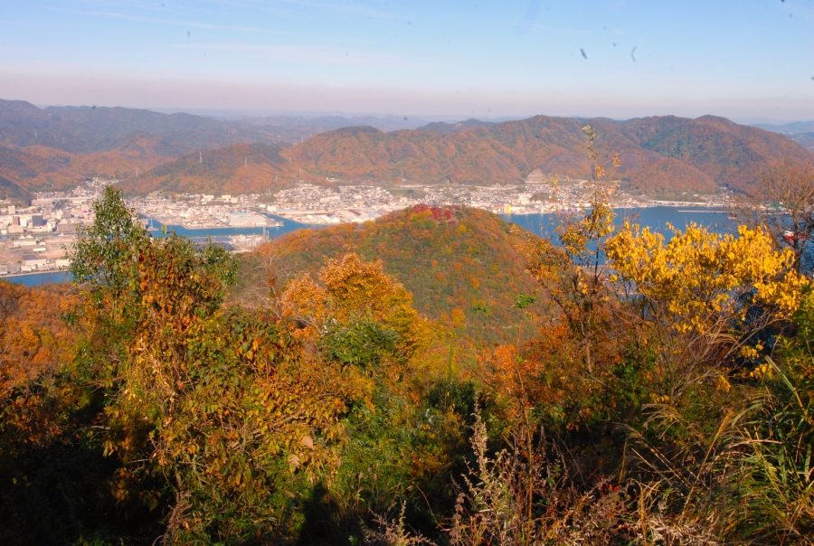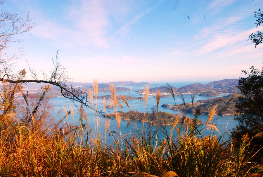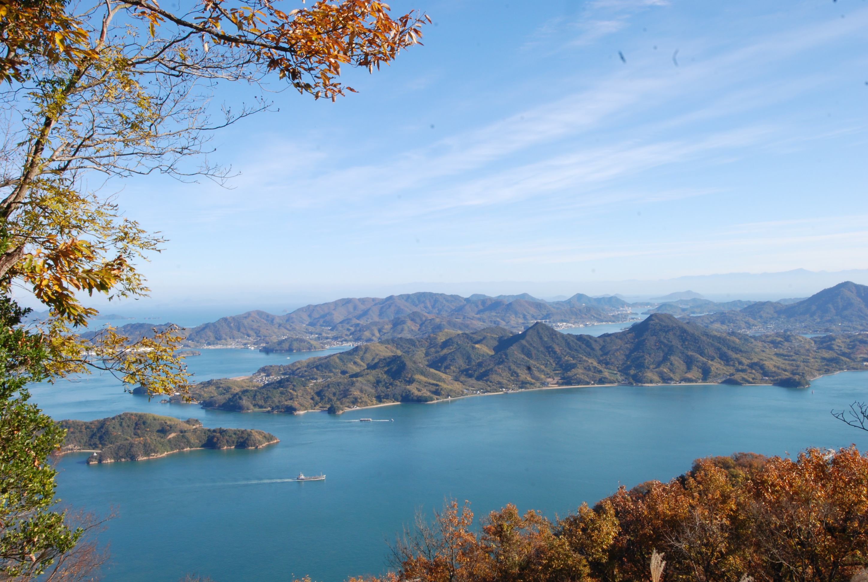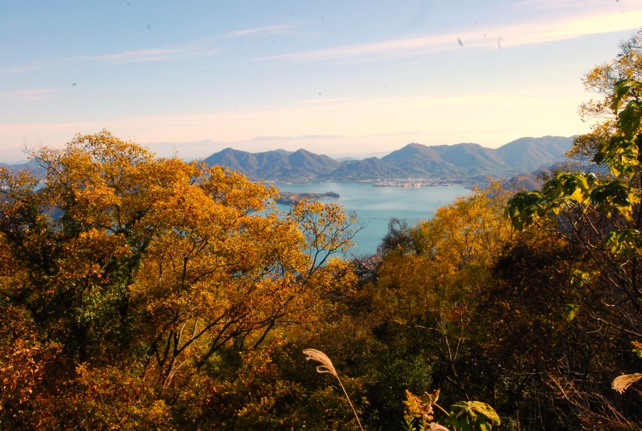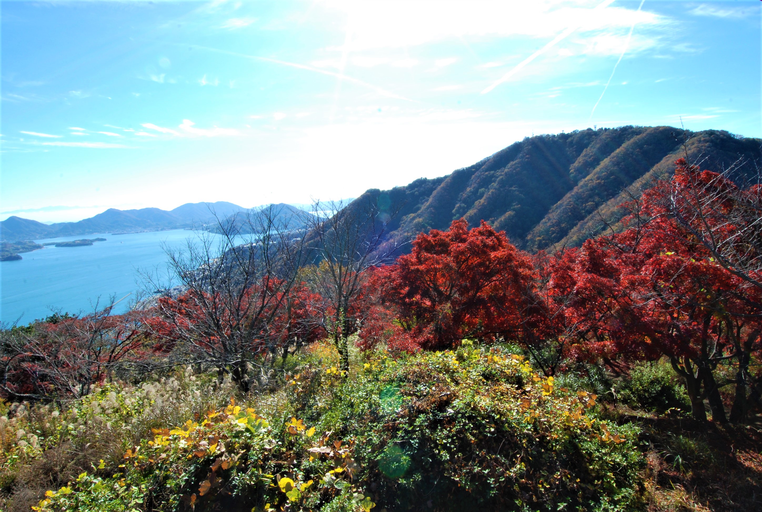 標高は445m。筆影山の南西に位置し、しまなみ海道10橋のうち、7橋を見ることが出来る絶景ポイントです。紅葉の「赤」と瀬戸内海の「青」が映える撮影ポイントです。