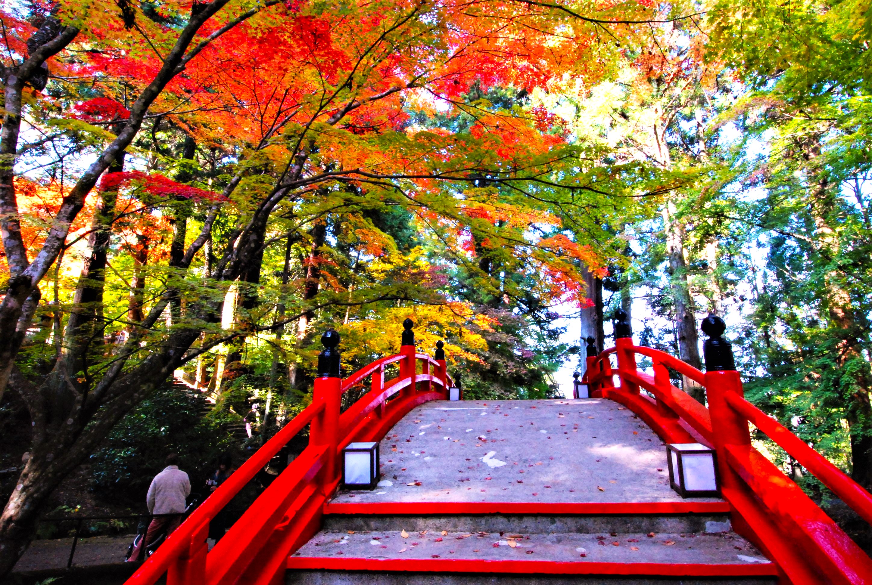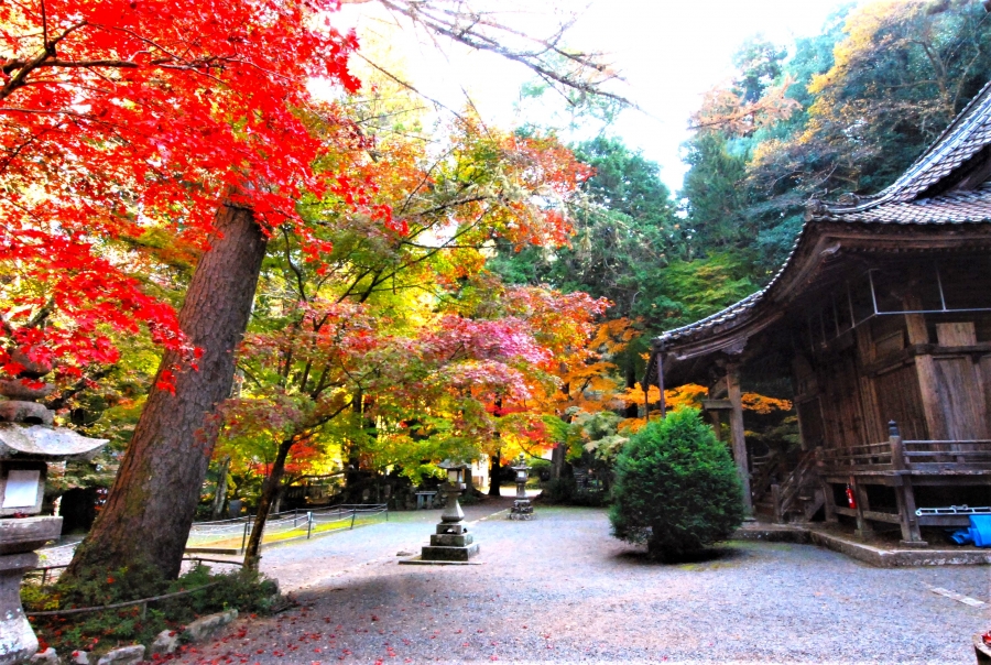 やはた川自然公園の中に鎮座する御調八幡宮は、三原市を代表する紅葉スポットの一つ。国の重要文化財となった木造狛犬や古版木、阿弥陀仏経が保存されています。ゆっくりと周辺散策するのに最適です。