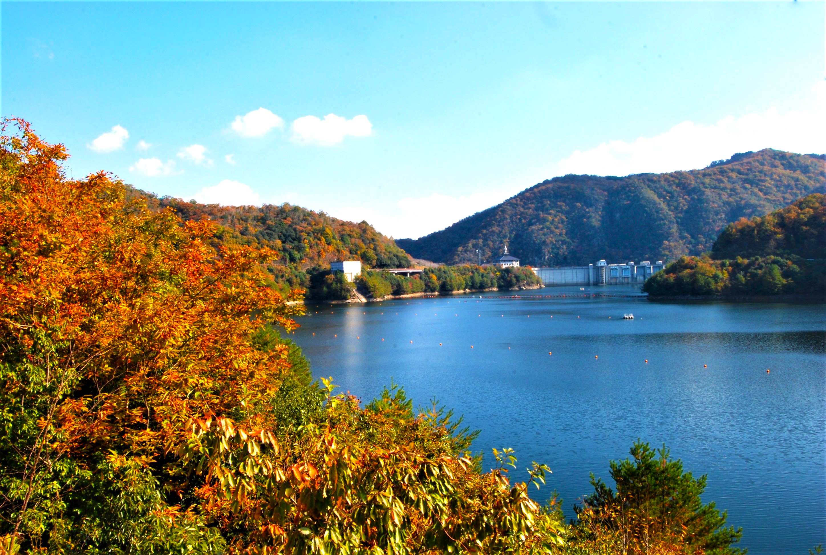 高さ85mの八田原ダムの水面に映る紅葉が見所!