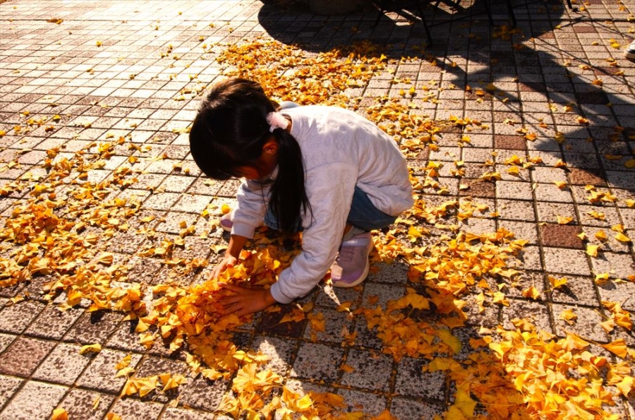 石窯ピッツァと旬な地元野菜が有名な「よがんす白竜」の黄色く色づいたイチョウの葉を投げ合う子供たち。青く澄んだ空とのコントラストが美しく魅了されます。湖畔にキャンピングカーから椅子を出してゆっくりするのも至福の時間です。